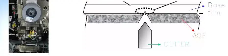 机器按照已设定长度,将ACF剪切后粘贴在LCD上。剪切方式为半切,过深或过浅都会造成ACF贴附问题。