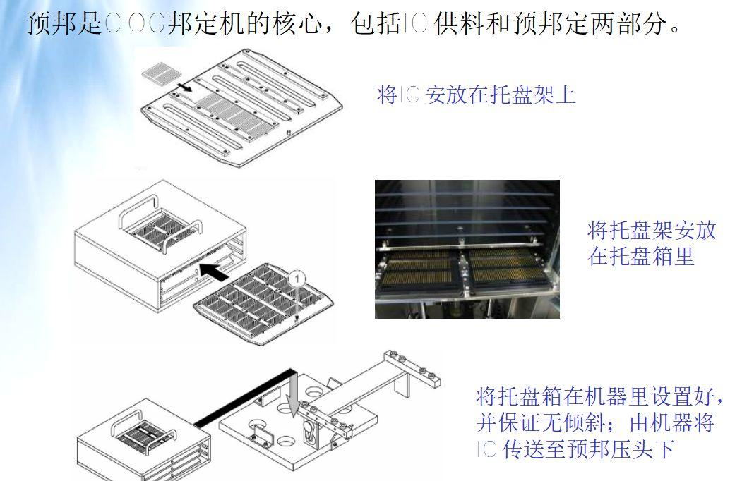 预邦定的作用是将IC Bump与LCD引脚精确对位,并粘接IC。邦定机利用CCD识别IC及玻璃mark,计算相对坐标后进行精确对位。(邦定机对位精度可以达到±3um)一般情况下,机器预邦参数:70±10℃、10~15N、0.5s