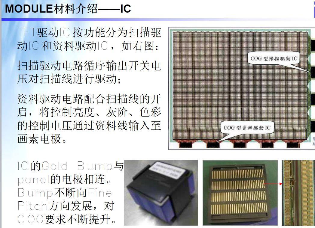 COG:中小尺寸产品IC封装的主流技术。使用ACF将裸片IC直接连接在LCD上。制程简化、Pitch小、成本低,只是返修稍困难。