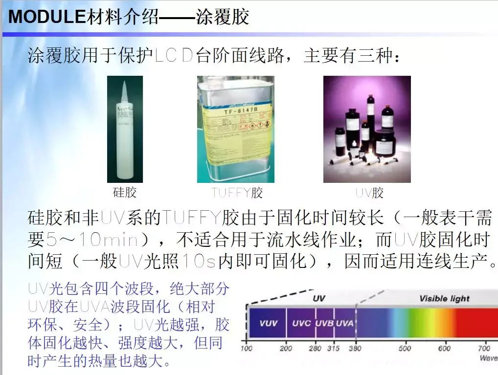 UV胶以紫外光固化,时间短、无污染、保护性佳、成本高。硅胶为RTV(室温硬化)胶材,吸湿固化,时间长、成本低。TUFFY胶分为非溶剂系和溶剂系两类。非溶剂系包括UV固化(同UV胶)和吸湿固化(同硅胶)两种;溶剂系为挥发溶剂(乙醇)固化,时间稍长,成本中。天马采用连线生产方式,要求作业时间短,现使用UV胶。