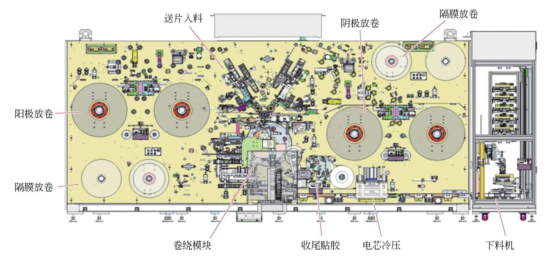 设备主要模块清单包括:极片/隔膜自动放卷模块,极片/隔膜换卷模块,自动纠偏模块,导辊模块,极耳导向抚平模块,主驱模块,张力控制模块,张力测量/显示与储存模块,极片入料模块,隔膜除静电装置,极耳打折/翻折及极片破损检测模块,CCD在线检测模块,极片切断模块,除尘系统,极片和隔膜不良品单卷与剔除模块,卷绕头组件,隔膜切断模块,隔膜吸附模块,贴终止胶带模块,自动卸料模块,裸电芯预压模块,下料模块,设备框架和大板模块。