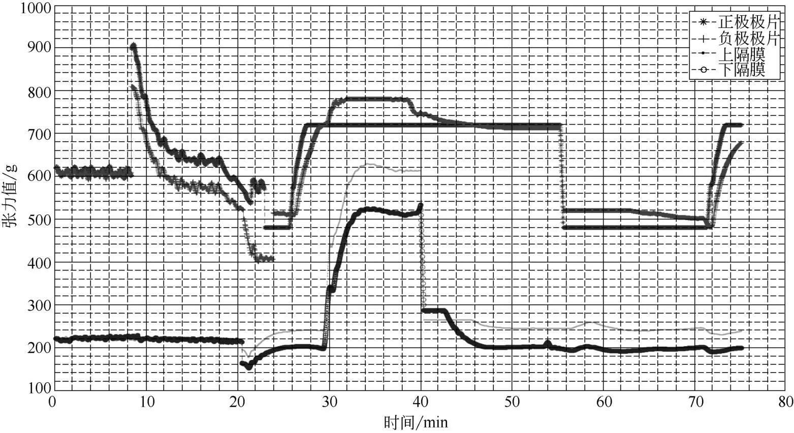 图9 极片单圈内极片、隔膜张力波动情况