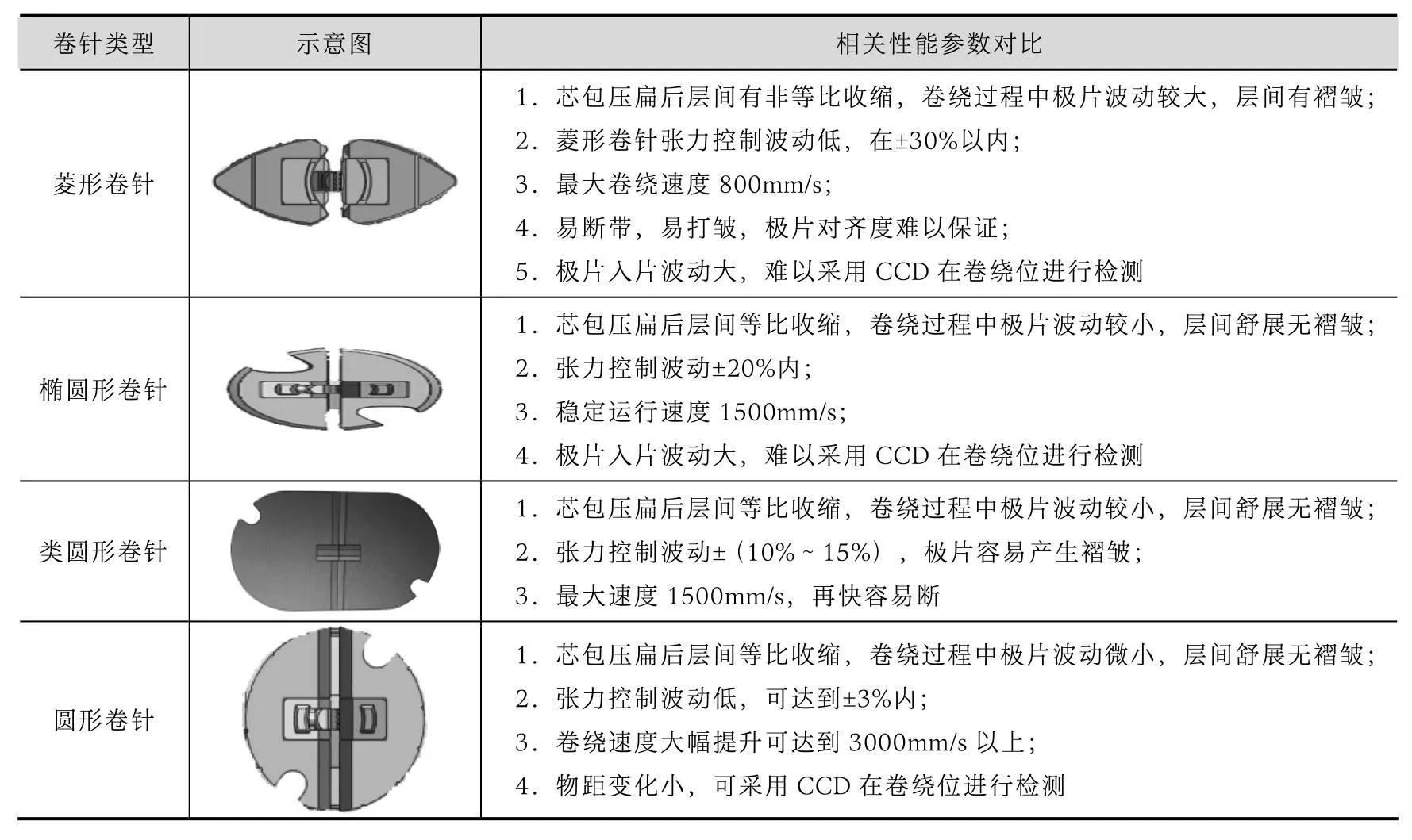 ⑦卷绕模块:由双工位或多工位机构设备双伺服电机或多伺服电机驱动机构,对应2套或多套卷针机构。同时配置换工位后转塔锁紧、定位机构。实现电芯的卷绕和不同卷绕工位的自动转换,并能实现恒线速度卷绕。可以实现正极或负极先入料卷绕、正负极同时入料卷绕的功能。在卷绕电芯制作过程中,防止电芯内部褶皱的产生是非常重要的事项。电芯内部的褶皱将导致电池在实际使用过程中的局部析锂,从而带来非常大的安全风险。针对褶皱的产生,存在卷绕褶皱定律:针对不同的卷针,卷绕芯包层间会存在褶皱的可能。产生褶皱的原因是当极片在卷针逐圈积累过程中,极片层间增大半径δ,同时极片的积累长度也会增大,当极片的积累周长长度增大变化率与卷绕半径增长率不相等时,卷绕抽针芯包压扁后,内部极片将产生褶皱现象,这就是卷绕褶皱定律。一般菱形卷针由于结构特性,在卷绕过程中极片张力波动较大,卷绕过程中极片周长增长率与半径增长率不一致,从而会导致层间褶皱现象的产生。相比较来说,椭圆形、类圆形、圆形卷针就不存在褶皱的问题。不同类型卷针对比见表2。