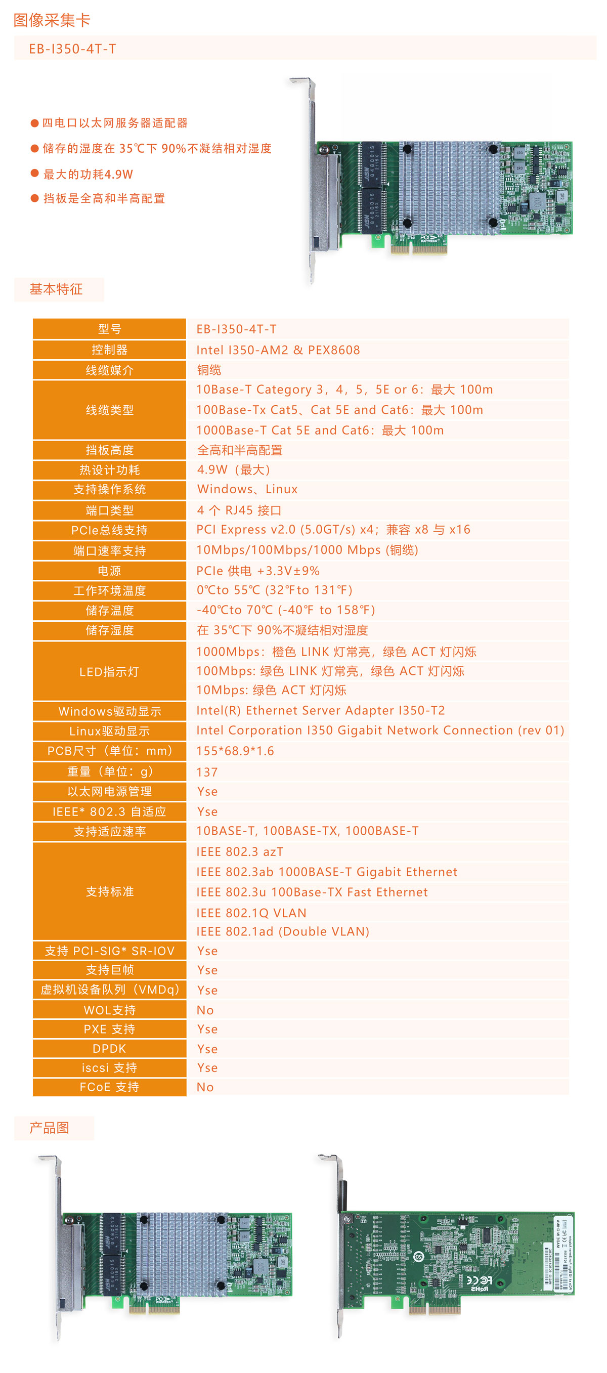 图像采集卡EB-I350-4T-T,是四电口以太网服务器适配器,最大的功耗4.9W,挡板是全高和半高配置。
