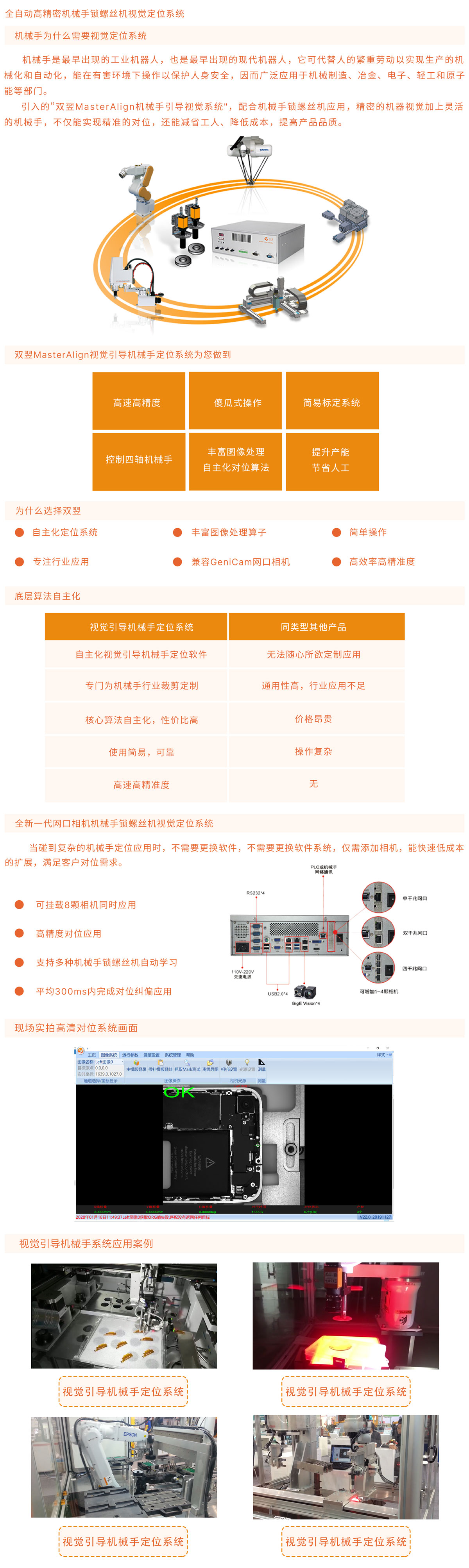 引入的“伟德国际唯一官网入口MasterAlign机械手引导视觉系统",配合机械手锁螺丝机应用,精密的机器视觉加上灵活的机械手,不仅能实现精准的对位,还能减省工人、降低成本,提高产品品质。