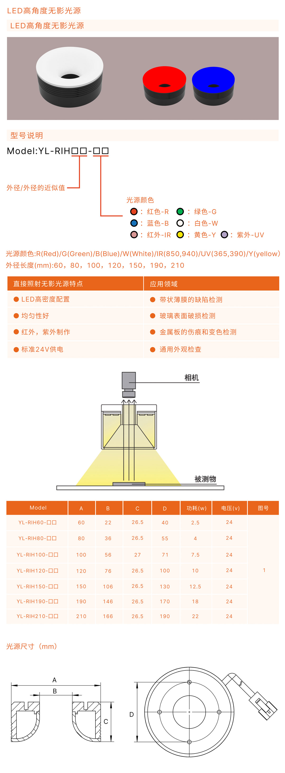 直接照射无影光源特点:LED高密度配置,均匀性好,红外,紫外制作,标准24V供电。