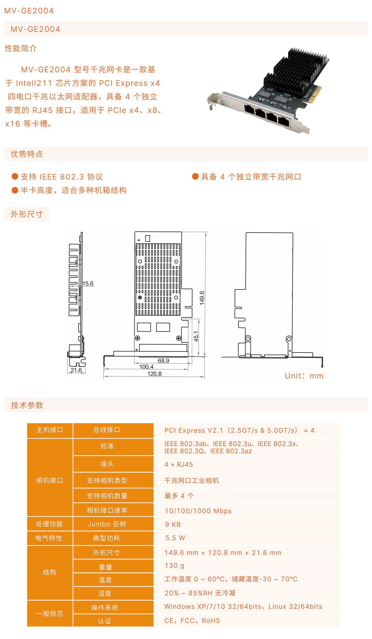MV-GE2004 型号千兆网卡是一款基于 IntelI211 芯片方案的 PCI Express x4 四电口千兆以太网适配器,具备 4 个独立带宽的 RJ45 接口,适用于 PCIe x4、x8、x16 等卡槽。
