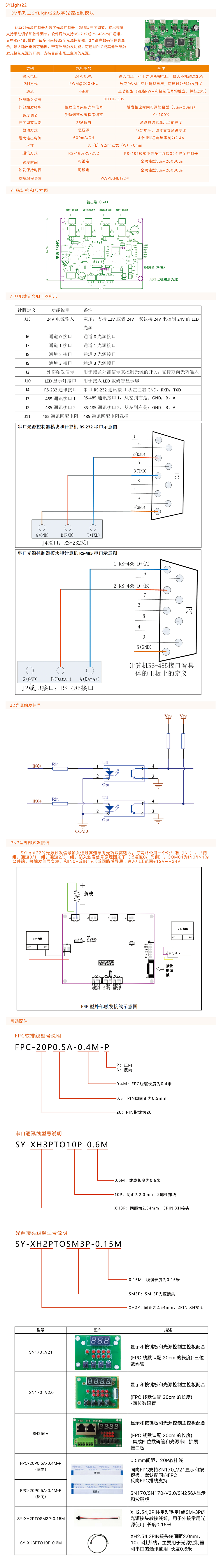 此系列光源控制器为数字光源控制器。256级亮度调节,输出亮度支持手动调节和软件调节,软件调节支持RS-232或RS-485串口通讯,其中RS-485模式下最多可串接32个光源控制器。3个高亮数码管信息显示,最大输出电流可选择。带有外部触发功能,可通过PLC或其他外部触发元控制光源的开关,支持目前市场上主流的光源。