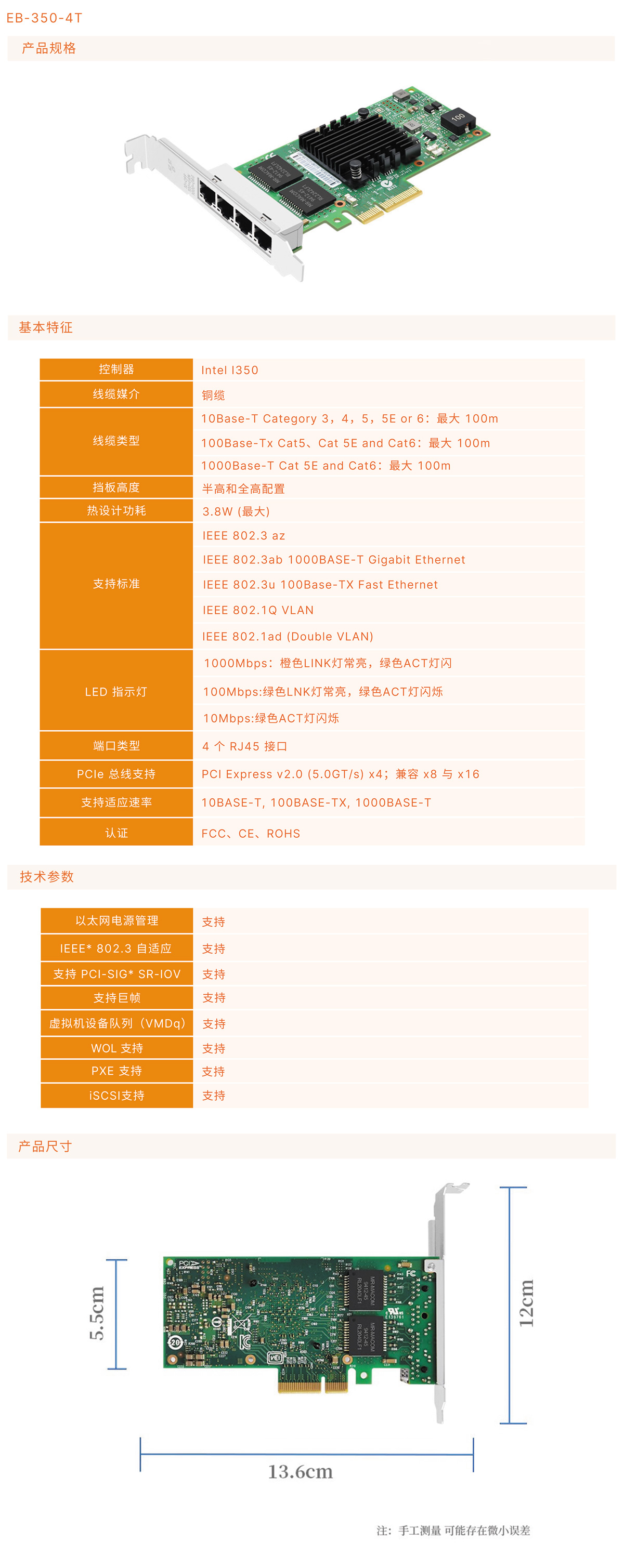 EB-350-4T采用PCI-e X4线路设计,集成四个千兆RJ45网卡接口。为台式电脑设备而设计的。并且对其性能进行了优化,使系统I/0不再是高端网络应用的瓶颈。启用通过分组容错。故障端口的流量会被路由到组里的其它成员。有一个集成的硬件加速功能,它执行TCP/UDP/IP校验以及TCP分段任务。主机处理技术可以分载加速器,释放CPU资源,用以处理其它应用程序。
