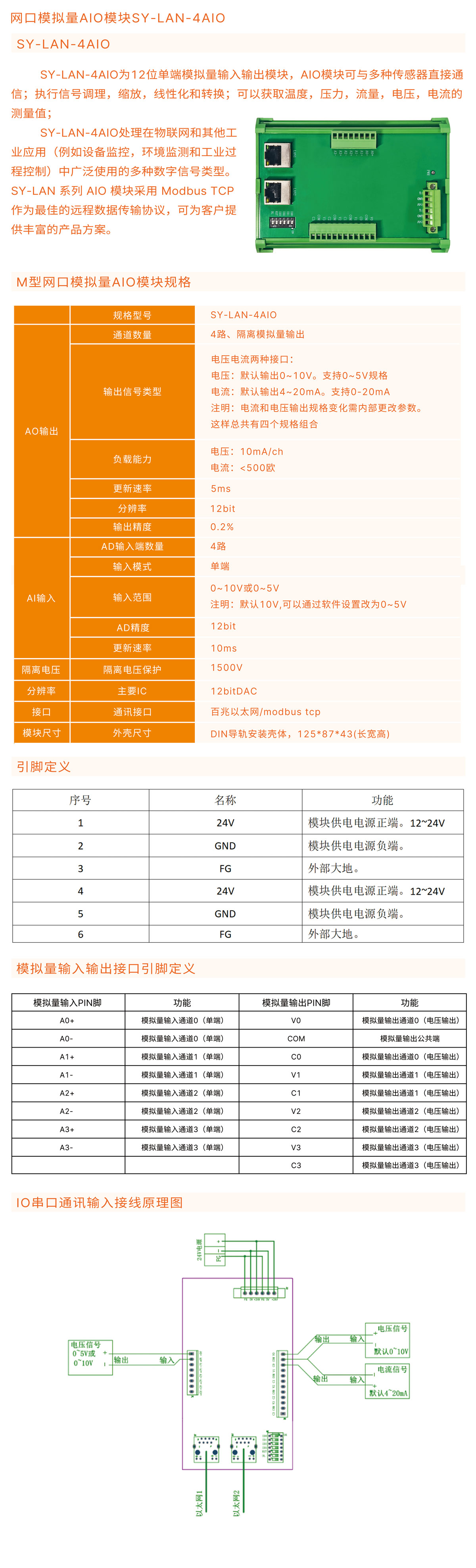 SY-LAN系列AIO模块是以太网接口模拟量AIO模块,4通道模拟量输出/4通道模拟输入支持 Modbus TCP 的远程 I/O 模块,并提供高达1500VRMS高电压隔离保护