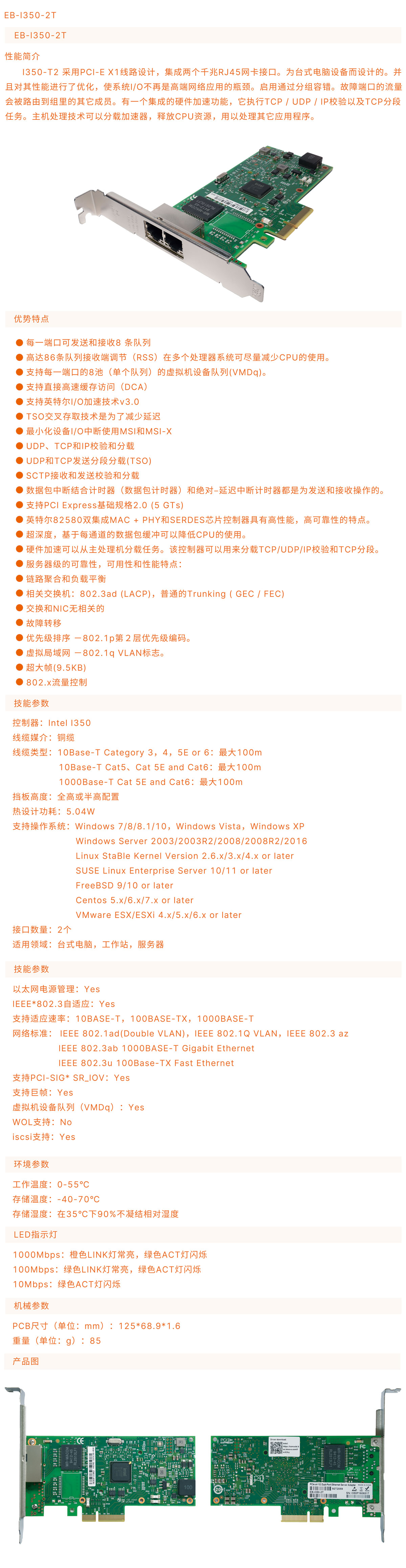 EB-I350-2T采用PCI-e X4线路设计,集成两个千兆RJ45网卡接口。为台式电脑设备而设计的。并且对其性能进行了优化,使系统I/0不再是高端网络应用的瓶颈。启用通过分组容错。故障端口的流量会被路由到组里的其它成员。有一个集成的硬件加速功能,它执行TCP/UDP/IP校验以及TCP分段任务。主机处理技术可以分载加速器,释放CPU资源,用以处理其它应用程序。