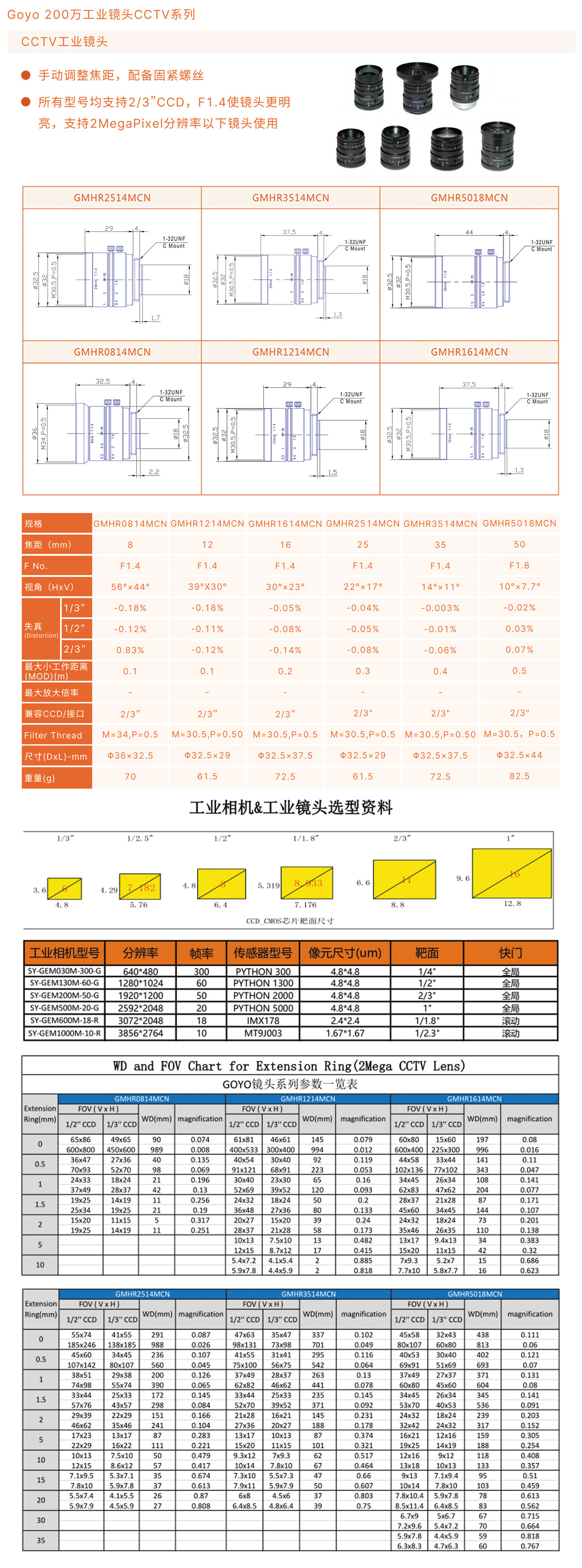 GOYO 2Mega镜头系列视野范围和工作距离关系