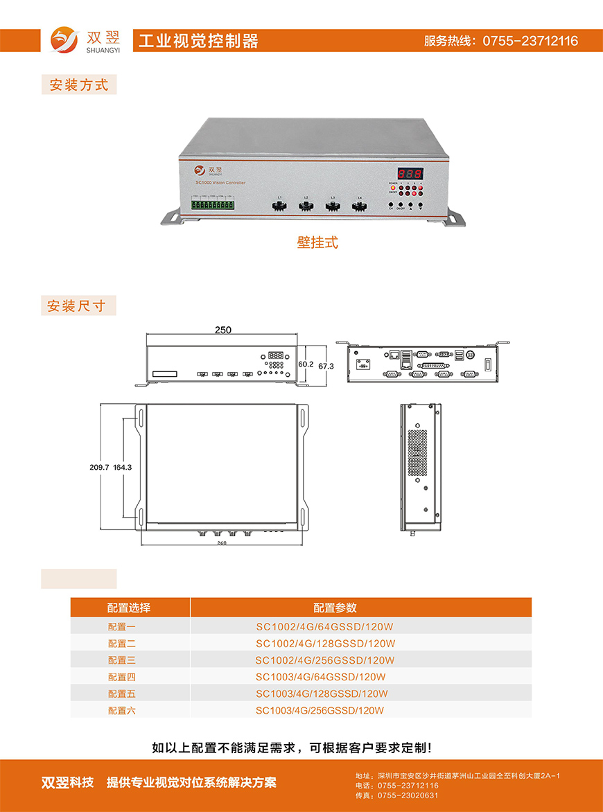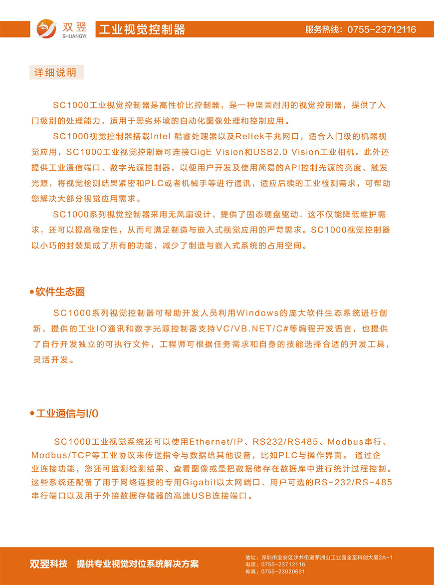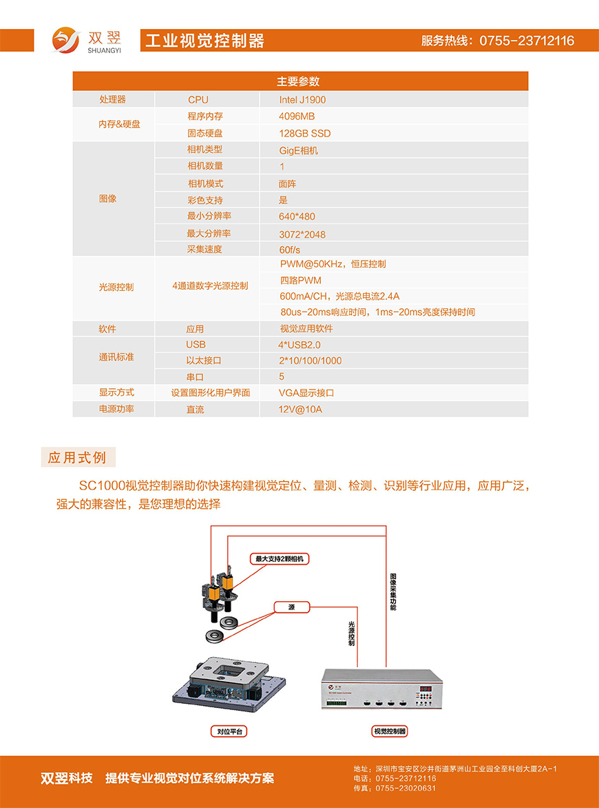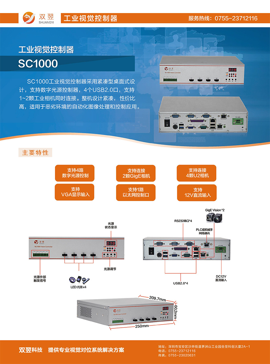 SC1000工业视觉控制器采用紧凑型桌面式设计,支持数字光源控制器,支持1~2颗工业相机同时连接。整机设计紧凑,性价比高,适用于恶劣环境的自动化图像处理和控制应用。