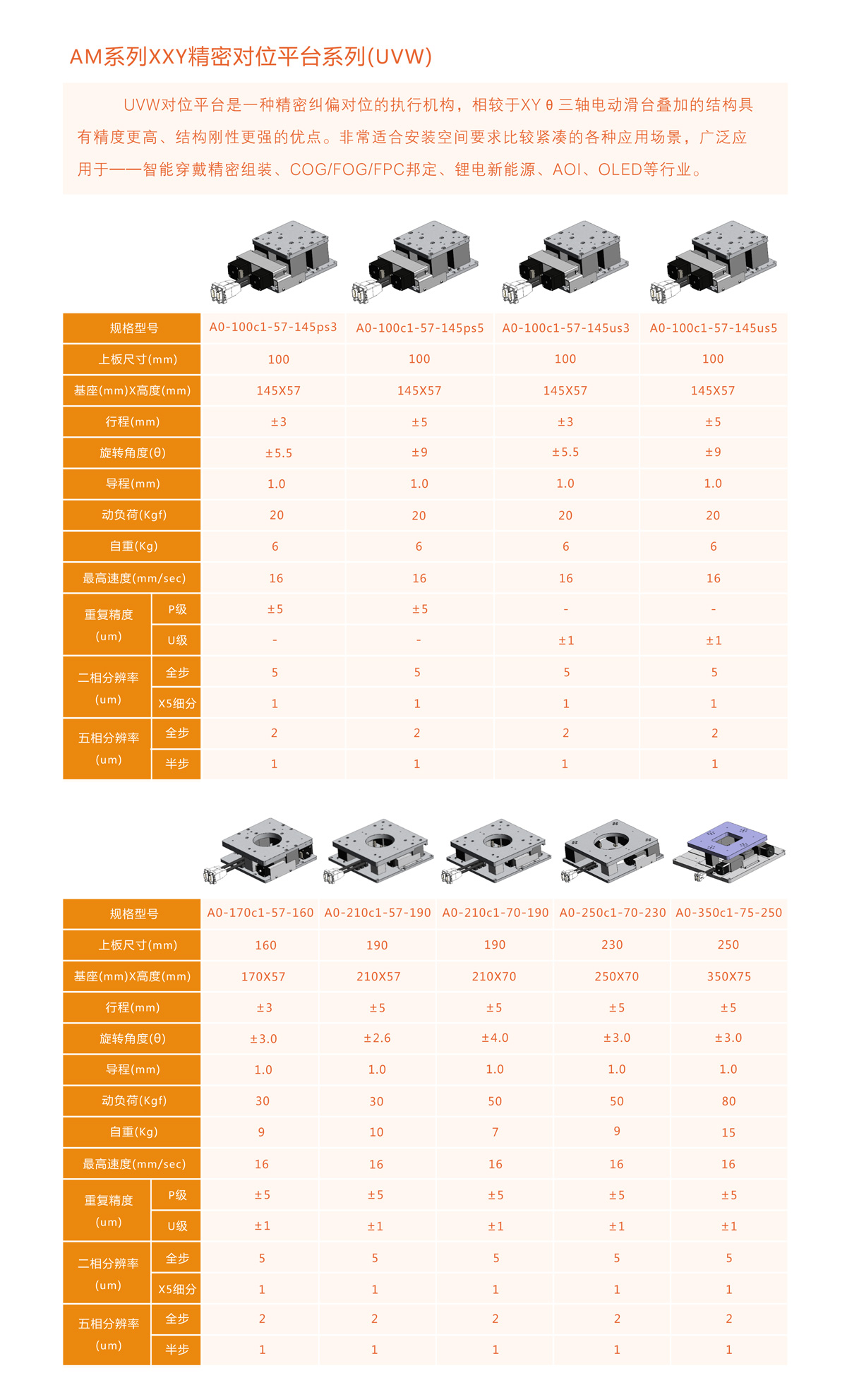 UVW对位平台是一种精密纠偏对位的执行机构,相较于XYθ三轴电动滑台叠加的结构具有精度更高、结构刚性更强的优点。非常适合安装空间要求比较紧凑的各种应用场景,广泛应用于——智能穿戴精密组装、COG/FOG/FPC邦定、锂电新能源、AOI、OLED等行业。