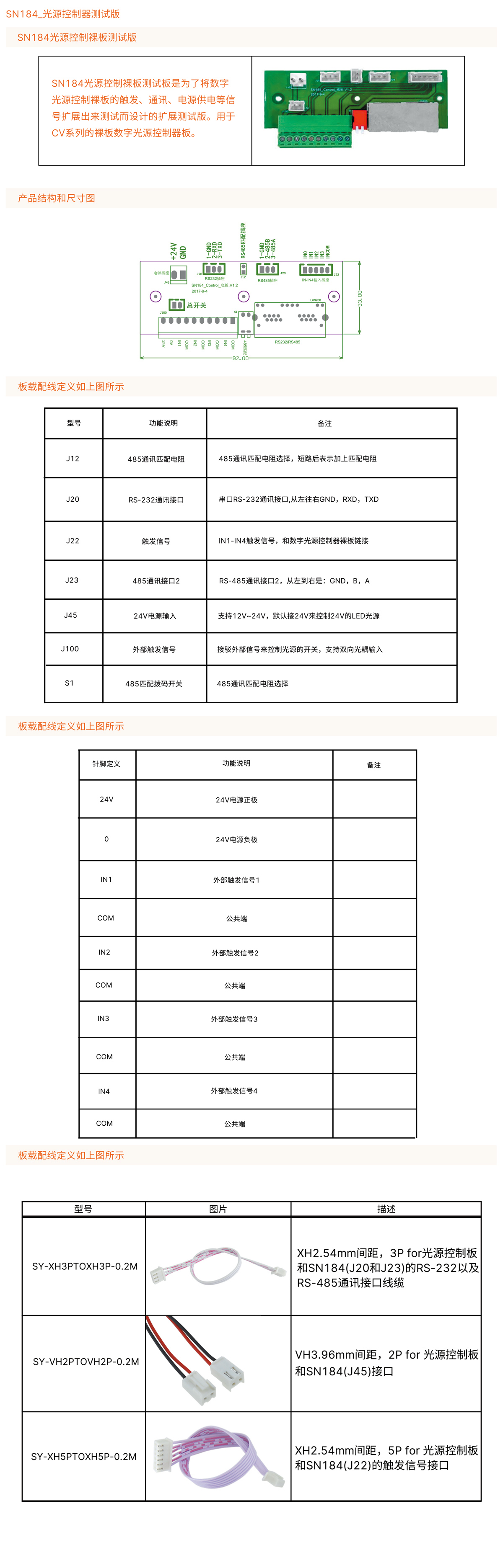 SN184光源控制裸板测试板是为了将数字光源控制裸板的触发、通讯、电源供电等信号扩展出来测试而设计的扩展测试版。用于CV系列的裸板数字光源控制器板。